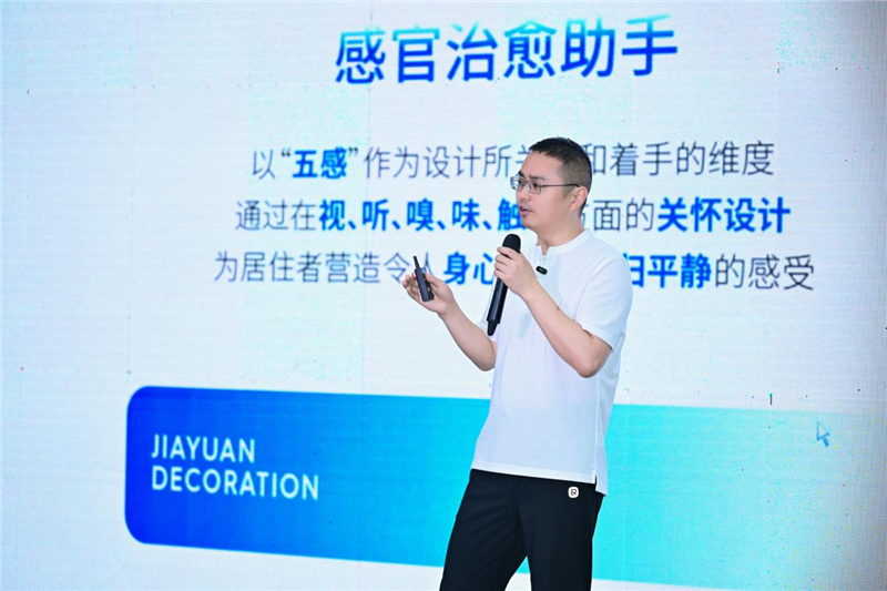 佳园装饰创始人 向歌在现场揭晓战略级解决方案——以“治愈”为核心,配合东方人文的优化,实现可复制设计系统,独创情绪引擎,引爆空间治愈力。从“健康智能治愈助手、高度个性化定制助手、生物亲和治愈助手、感官治愈助手、社交情绪空间助手”五个切入点,构建真正具有“治愈力”的家居设计系统。