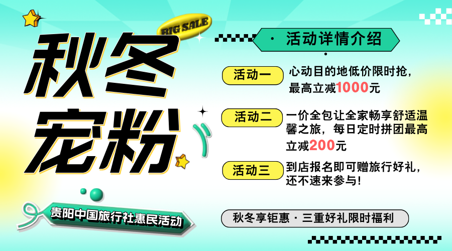 一重福利:通过心动目的地·投票活动得出的心动目的地名次后,推出心动目的地限时限量低价抢活动,活动优惠最高立减1000元!二重福利:贵阳中国旅行社一价全包让全家畅享舒适温馨之旅活动,每日定时两人以上拼团,活动优惠最高立减200元!三重福利:活动期间,在贵阳中国旅行社线下任意门店完成成交即送成交好礼一人一份,还不速来参与!