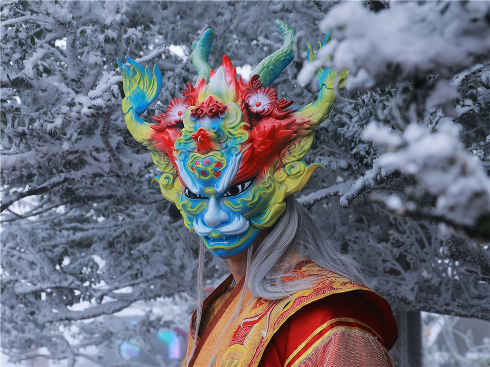 活动当天,梵净山景区内小雪纷飞,山顶银装素裹,雾气缭绕于奇山异石之间,仿若人间仙境,为活动增添了一抹梦幻色彩。游客们纷至沓来,共同见证这场文旅盛事。随着活动的深入,一个特别的环节吸引了所有人的目光——模特戴上生肖龙面具,以神秘而威严的形象在景区蘑菇石、普渡广场与游客线下见面,并与游客展开互动,赠送文创小礼品等。