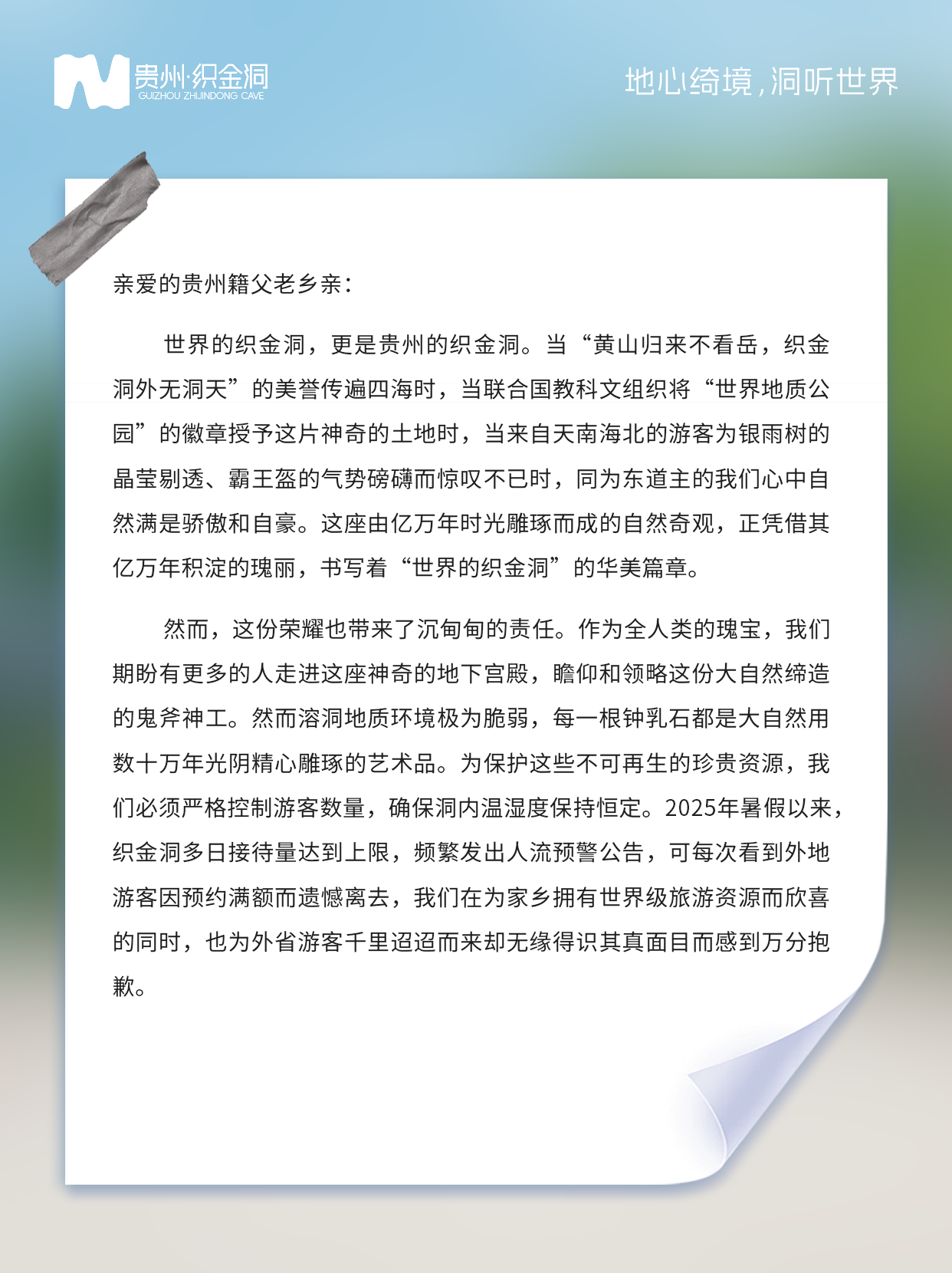 面对汹涌客流,织金洞景区多次发出人流预警公告。对此,织金洞于8月3日发布了一封致贵州人民的信,首次明确提出:“建议贵州本地游客错峰出行,将暑期旺季资源让给远道而来的外地游客”。这一倡议迅速在社交媒体引发两极反应。
