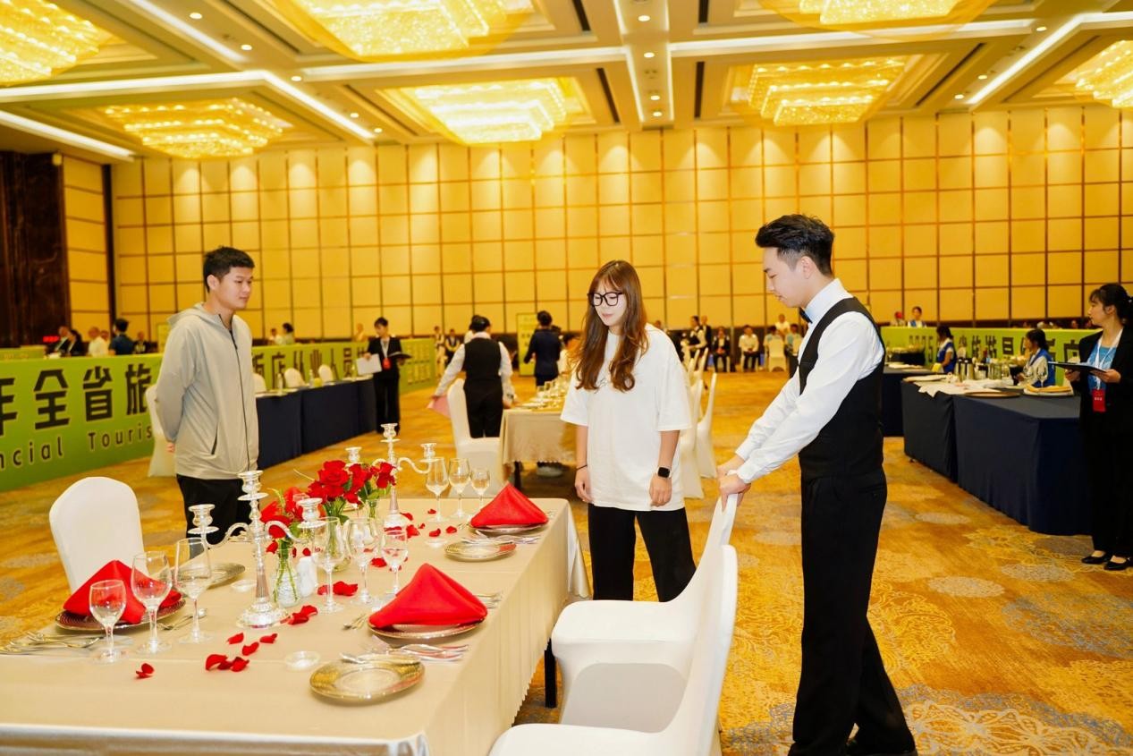 开幕式当天进行的现场实操竞赛,围绕星级饭店核心岗位,设置了前厅接待服务、客房服务、西餐服务、中餐服务四大竞赛项目,并通过“理论+实操+团体展示”相结合的方式,综合考查选手的业务知识、操作规范、沟通协调与临场应变能力。值得关注的是,为进一步对接国际服务标准,大赛还特别增设英语竞赛环节,突出对从业人员多语言服务能力的前瞻性要求。