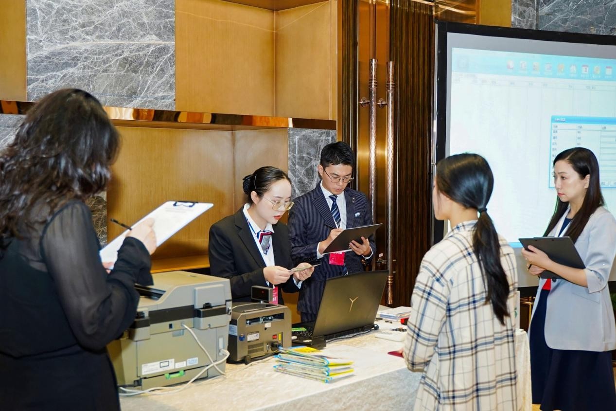 前厅服务赛区分为内宾接待服务和外宾接待服务。其中,内宾接待服务需要参赛选手在规定时间内,完成包括迎宾、推销、运用PMS系统办理入住登记、结账服务等操作;外宾接待服务则需要选手全程使用英语完成外币结算业务,并介绍贵州省的城市情况及旅游资源。选手们面对“客人”的各类咨询与突发状况,从容不迫,对答如流,流利的英语口语更是令人印象深刻。